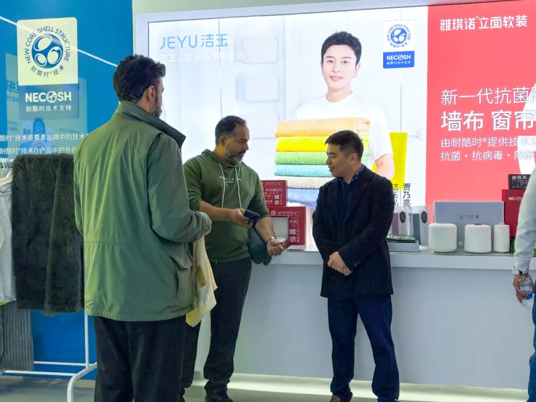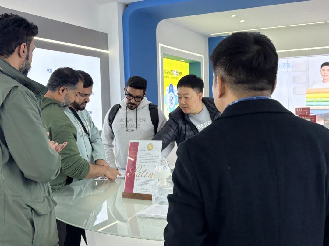 商贸团一行先后参观了耐酷时技术研发中心与产品展示中心,在副总经理周新伟的讲解下,详细了解了公司“技术品牌+新材料”双引擎发展模式,耐酷时技术在纺织品抗菌除味、新材料应用等领域的核心优势,现场通过产品实物展示与技术原理演示,商贸团成员近距离感受了耐酷时专利技术在提升产品功能性与安全性上的创新突破,对其在户外装备、日常消费等场景的应用前景表现出浓厚兴趣。